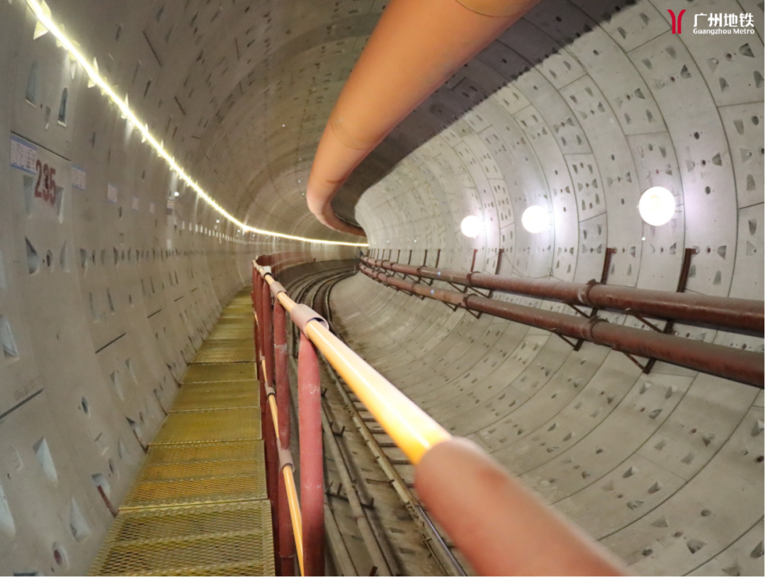 为解决小半径、大坡度、长距离掘进的难题,广州地铁联合施工单位中建四局选用盾体为前大后小梭式结构的盾构机,并缩短盾构机主机长度、增大刀盘开挖直径、缩短管片长度,以适用于小曲线、长距离掘进的工况。此外,广州地铁还牵头组织中国建筑芳白城际总包部等单位开展新型盾构导向系统及盾构智能掘进辅助系统科研工作,自动计算后续每环盾构掘进最优推进油缸行程和管片拼装点位,能有效控制盾构姿态、确保管片拼装和隧道线型质量。