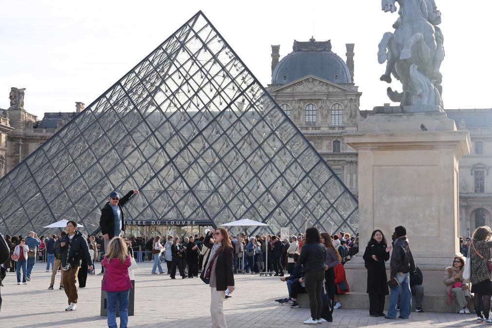 10月22日,在法国巴黎,大量游客聚集在卢浮宫博物馆的玻璃金字塔入口前。新华社记者 张百慧 摄
