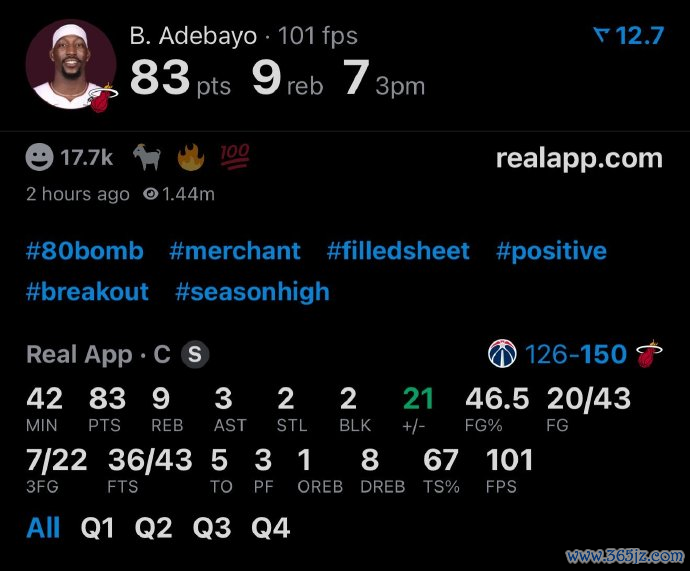 比赛从第三节开始,热火队其他球员不停给阿德巴约喂球,单节再拿下19分。