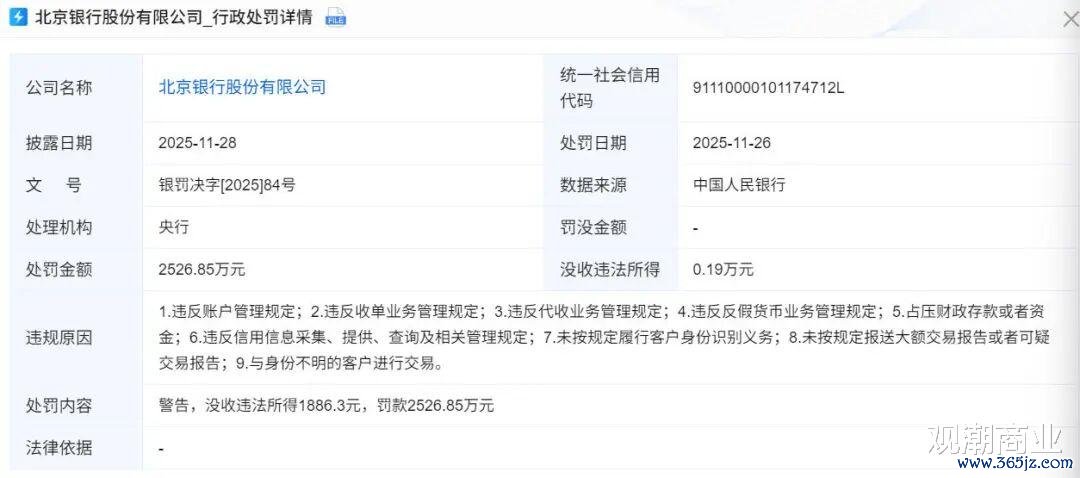 11月28日,北京银行因“违反账户管理规定;违反收单业务管理规定;违反代收业务管理规定;违反反假货币业务管理规定;占压财政存款或者资金;违反信用信息采集、提供、查询及相关管理规定;未按规定履行客户身份识别义务;未按规定报送大额交易报告或者可疑交易报告;与身份不明的客户进行交易”等9项违法违规行为,被监管部门警告、没收违法所得1886.3元,并罚款2526.85万元。同时,11名来自运营管理部、零售银行部、法律合规部等10个核心部门的责任人被处以1万至21万元不等的罚款,其中北京银行零售银行部侯某因4项违规被警告并罚款21万元。