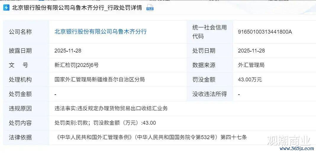 同样是11月28日,北京银行乌鲁木齐分行因“违反规定办理货物贸易出口收结汇业务”,被外汇管理局罚款43万元。