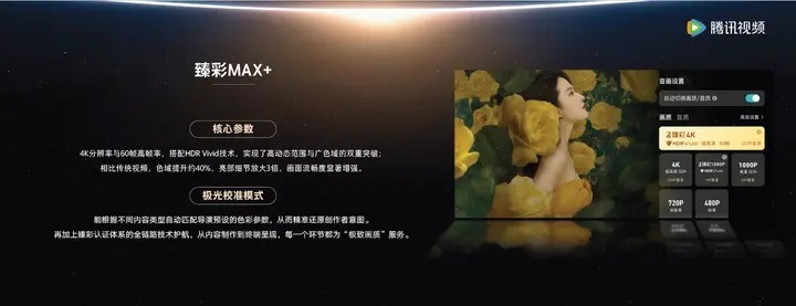 “臻彩MAX+”是腾讯视频“臻彩视听”系列自主研发品牌的一次重磅升级,所搭载的超高清4K HDR Vivid 实现了高动态范围与广色域的双重突破。该产品不仅让画面更清晰,支持4K的超高分辨率与60帧的高帧率;还显著增强了画面流畅度、让更多影像的细节之美被看见。在“臻彩MAX+”的加持下,画面的色域值可提升40%、亮部细节可放大3倍。