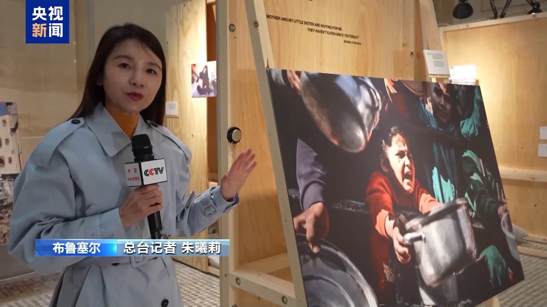 总台记者 朱曦莉:除了照片之外,在展览厅里我们还能够听到来自加沙的声音,这是加沙孩子们在排队领取食物的时候,锅碗瓢盆碰撞在一起发出的声音。这个8岁的孩子说,他已经等了两个多小时,但没有等到任何的食物,而他的妈妈和妹妹还在家里等着他把食物带回家去,他们全家已经有很长时间没有吃任何东西了。这些真实的经历,这些真实的声音,一下子将观众带到了加沙孩子们所身处的残酷世界。