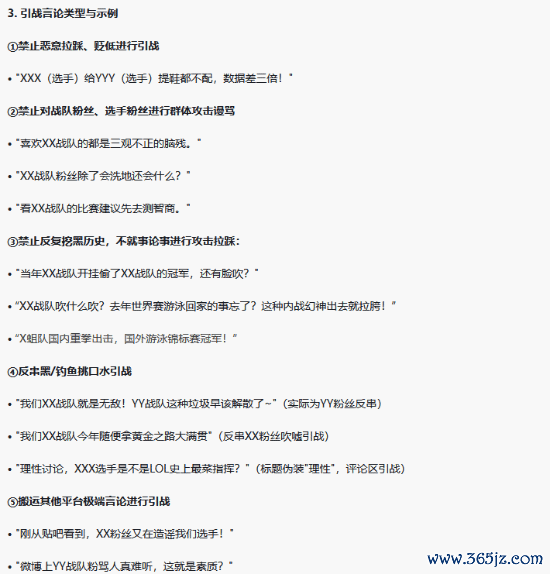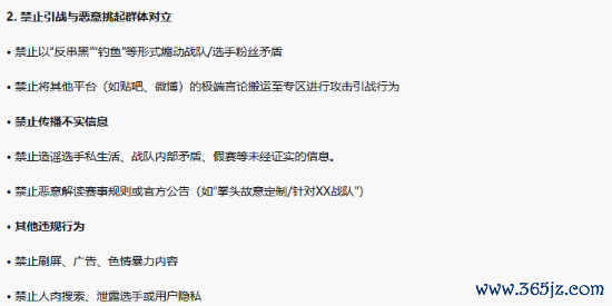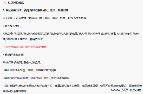 首先,将禁止使用攻击、侮辱性词汇指代战队、选手、粉丝群体,如“X÷/科目四/糖人/玉玉”等词汇及其变体将被视为违规内容天通盈,同时禁止攻击选手外貌、家庭等非竞技因素。